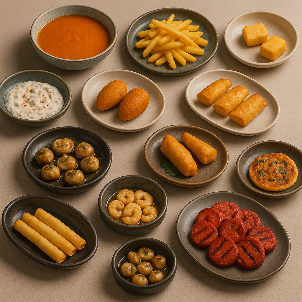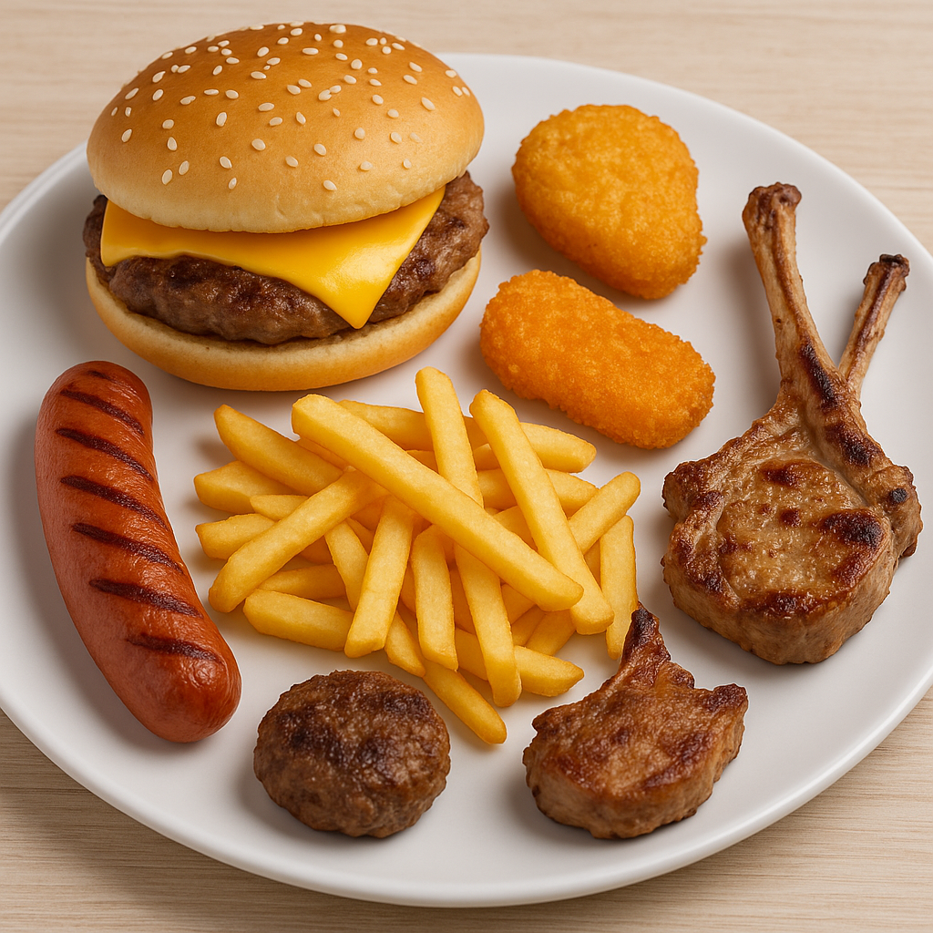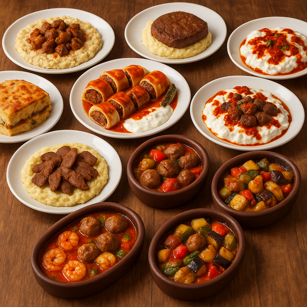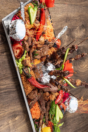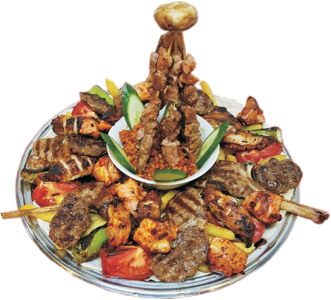 Adana, Köfte, Tavuk Şiş, Tavuk Kanat, Pirzola, Çöp Şiş, Kuzu Şiş, Pilav, Patates, Domates, Biber Adana, Meatballs, Chicken Shish, Chicken Wings, Chops, Skewers, Lamb Skewers, Rice, Fries, Tomatoes, Peppers