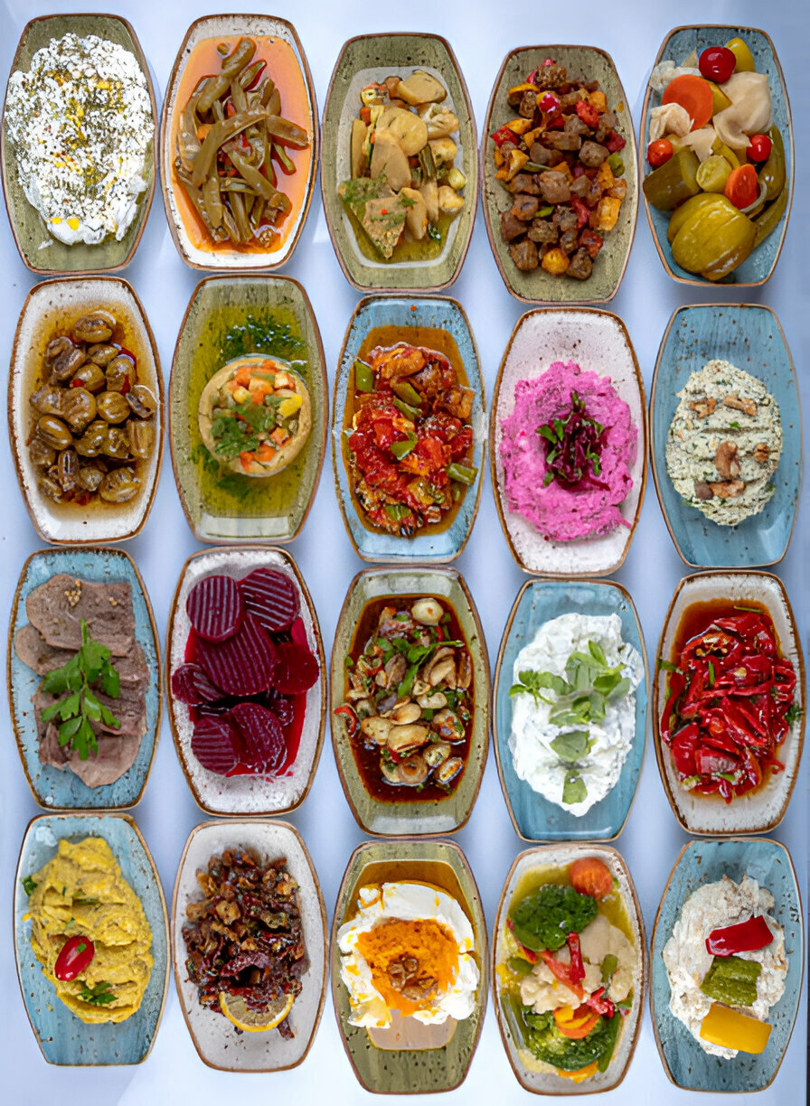 Domates, salatalık, mevsim yeşillikleri, 3 çeşit peynir, bal, tereyağı, 2 çeşit reçel, 2 çeşit zeytin, salam, sahanda yumurta, sigara böreği, pişi, patates kızartması, meyve